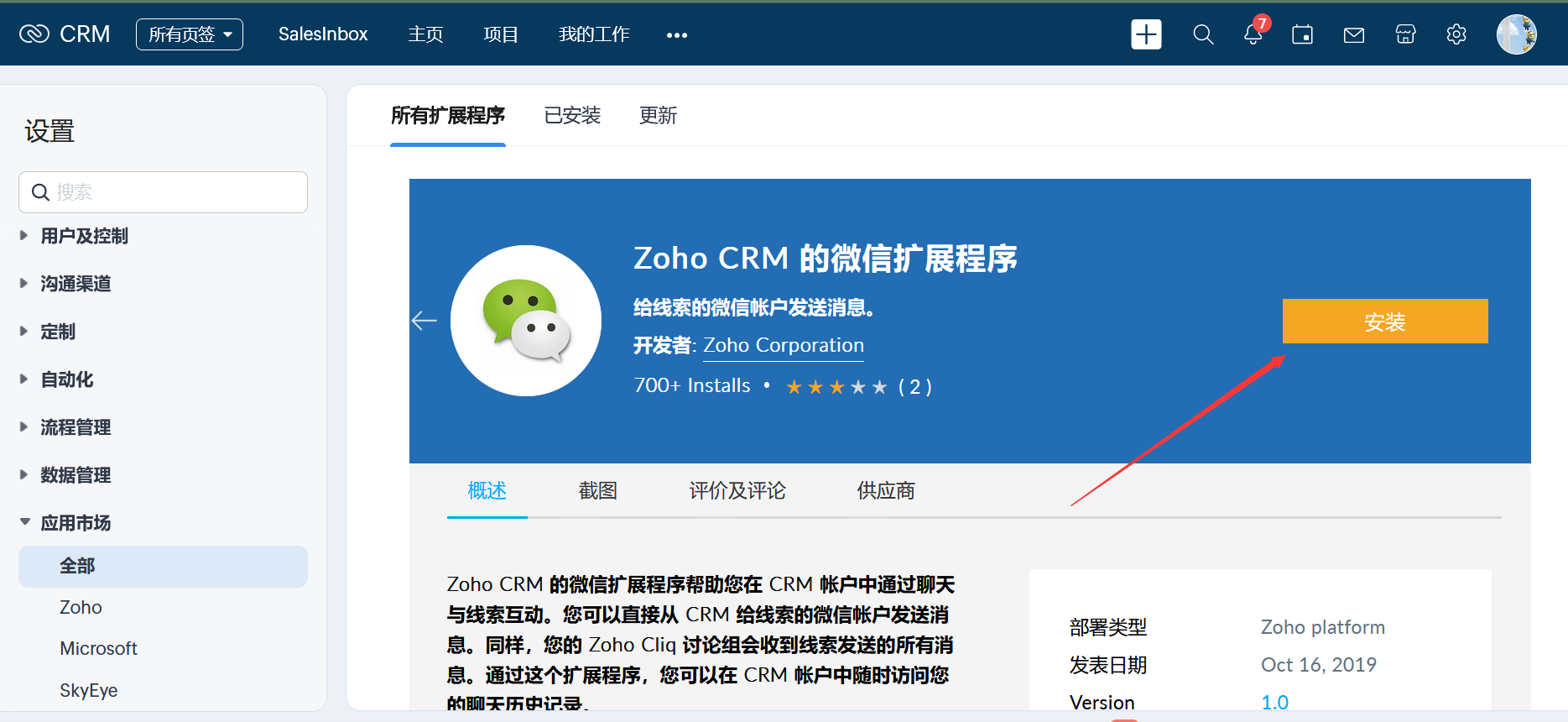 - 点击 所有扩展程序,搜索并选择 Zoho CRM的微信扩展程序。