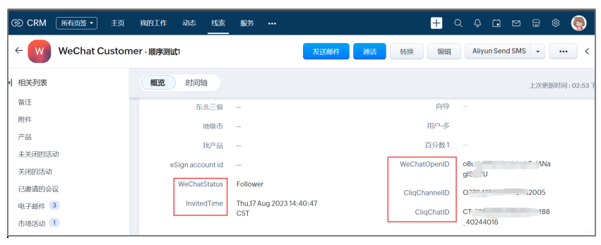 - 在Zoho CRM内,微信状态将会更新为已邀请,邀请时间将会更新为发送该邀请的日期和时间。
