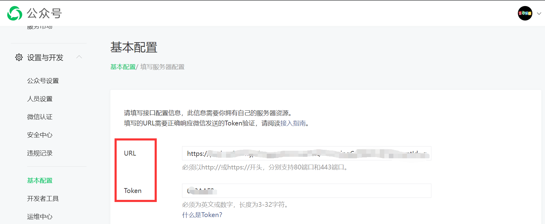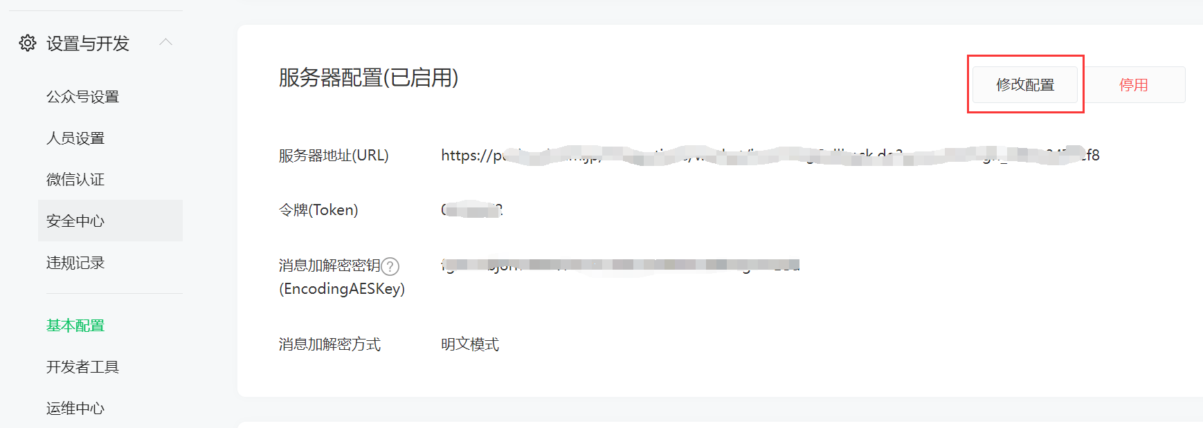 - 在微信公众号网页,转至 开发 > 基本配置 > 服务器配置。