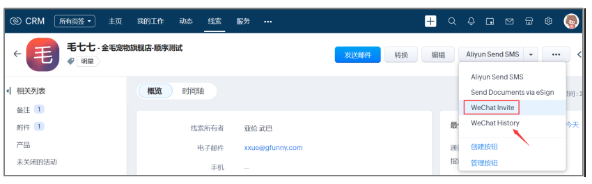 或者,打开您Zoho CRM账户内的一条线索,访问其记录详情页面,然后发送微信邀请。这里,也可以查看与该线索的微信聊天历史。