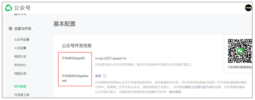- 转至 设置与开发 > 基本配置 > 公众号开发信息。
