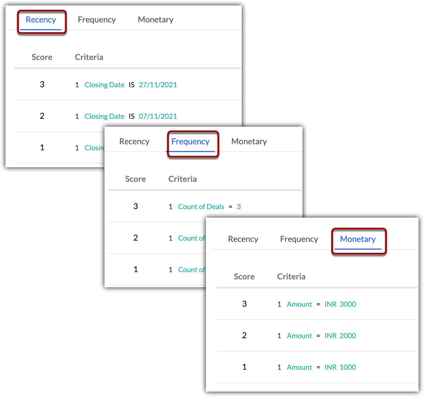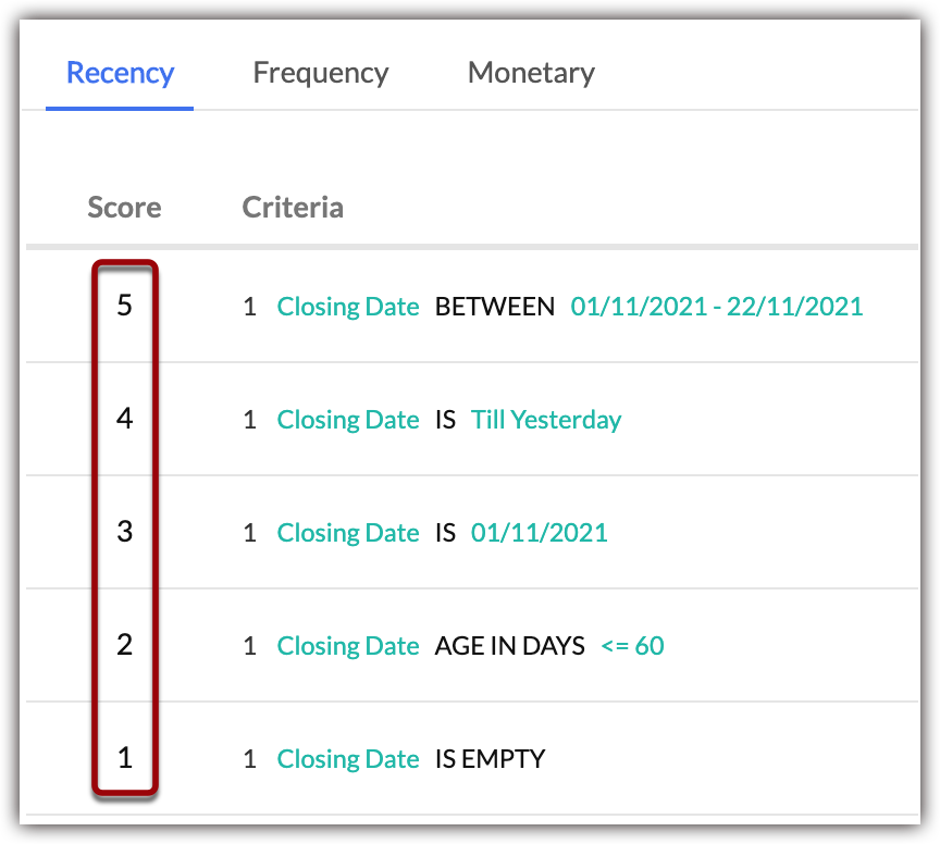 - 如果赢单日期是“在本周和上周之间”或“不是上个月”,则输入R得分为5。 同样,如果最近的购买时间是“直到昨天”,则得分为4。