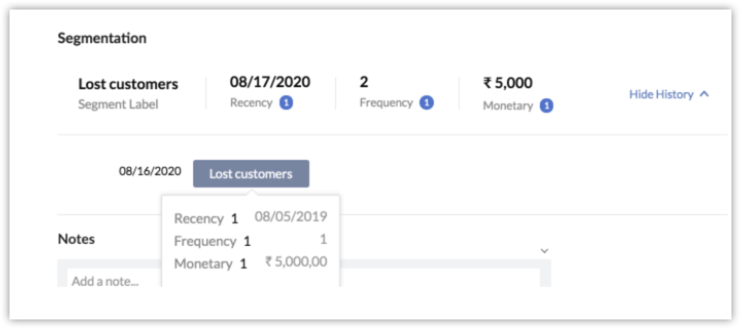 一旦创建了细分,将在记录详情页面中添加一个名为细分的部分。在这里,您可以查看客户购买的完整详细信息,例如他们以前的得分、货币价值、购买时间、购买次数和花费金额。