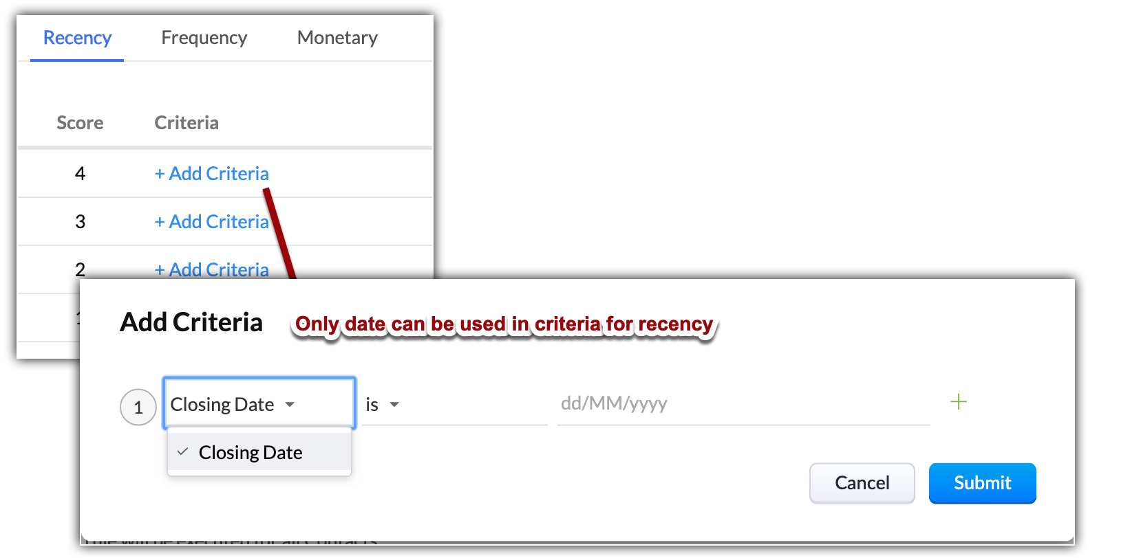 是的,只有当Zoho Campaigns和MarketingHub平台与CRM帐户集成时,细分结果,即每个联系人的R、F和M值才会显示在这些平台上。