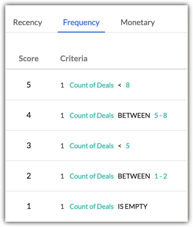 对于R分数,数据集将从最近的购买到最早的购买进行排列。 例如,如果最近的购买是一周前,最早的购买是6个月前,CRM将设置这两个时间作为边界,并在此时间段内绘制百分比数。得分每隔20个百分点就会改变一次。