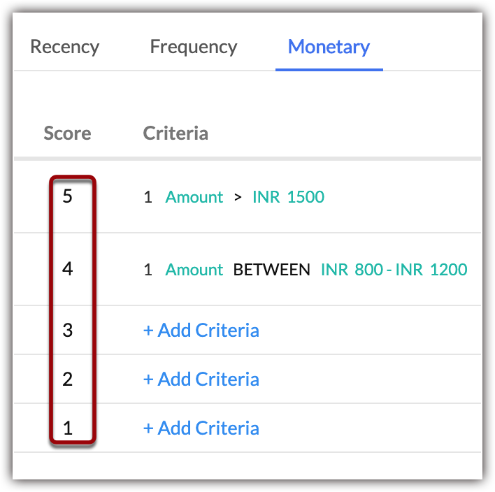 手动: 您必须手动定义条件,并为系统设置用于计算R、F和M分数的得分。
