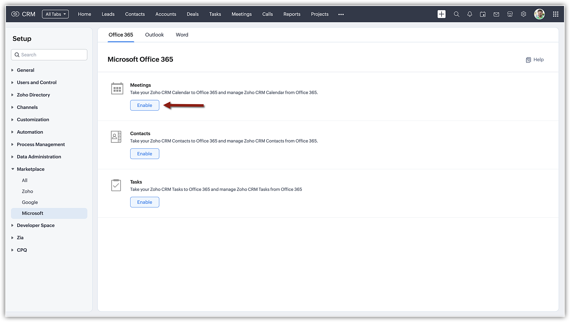要启用 Zoho CRM 会议与 Office 365 的同步