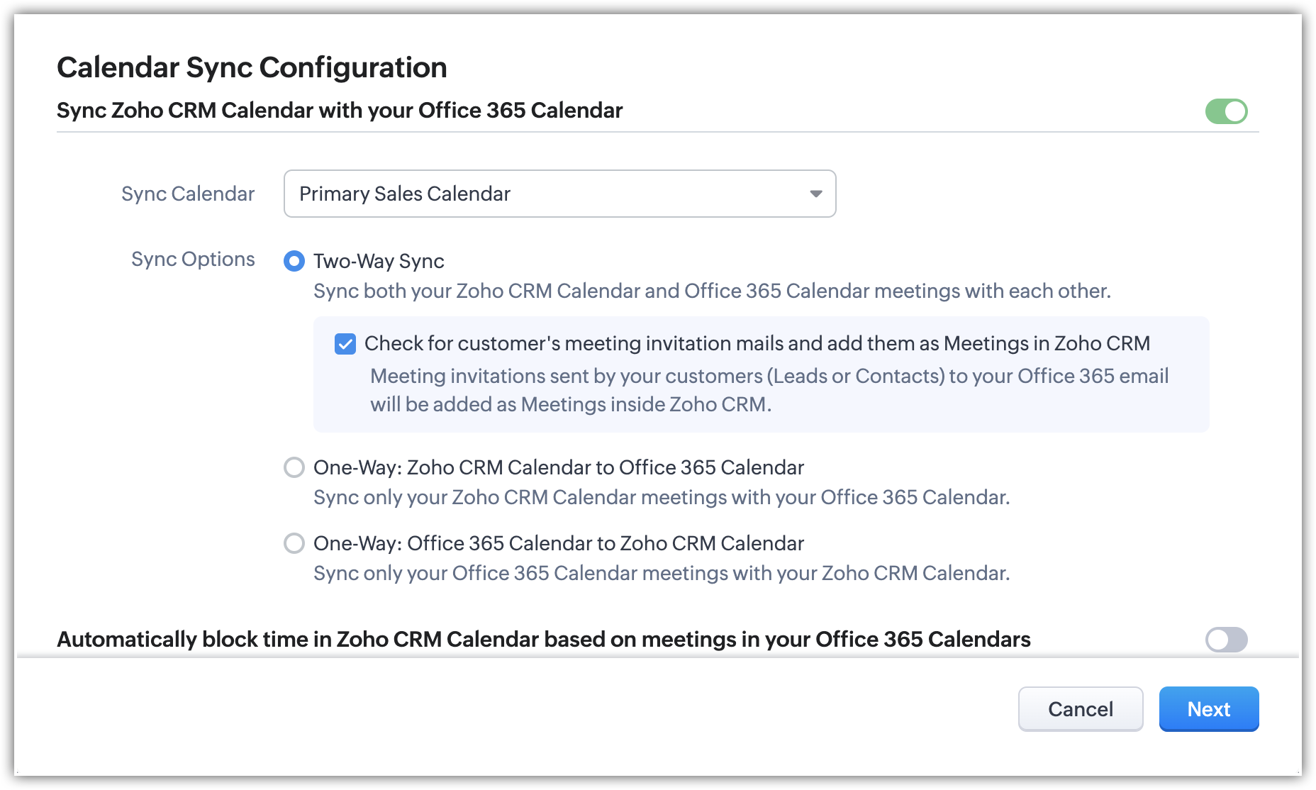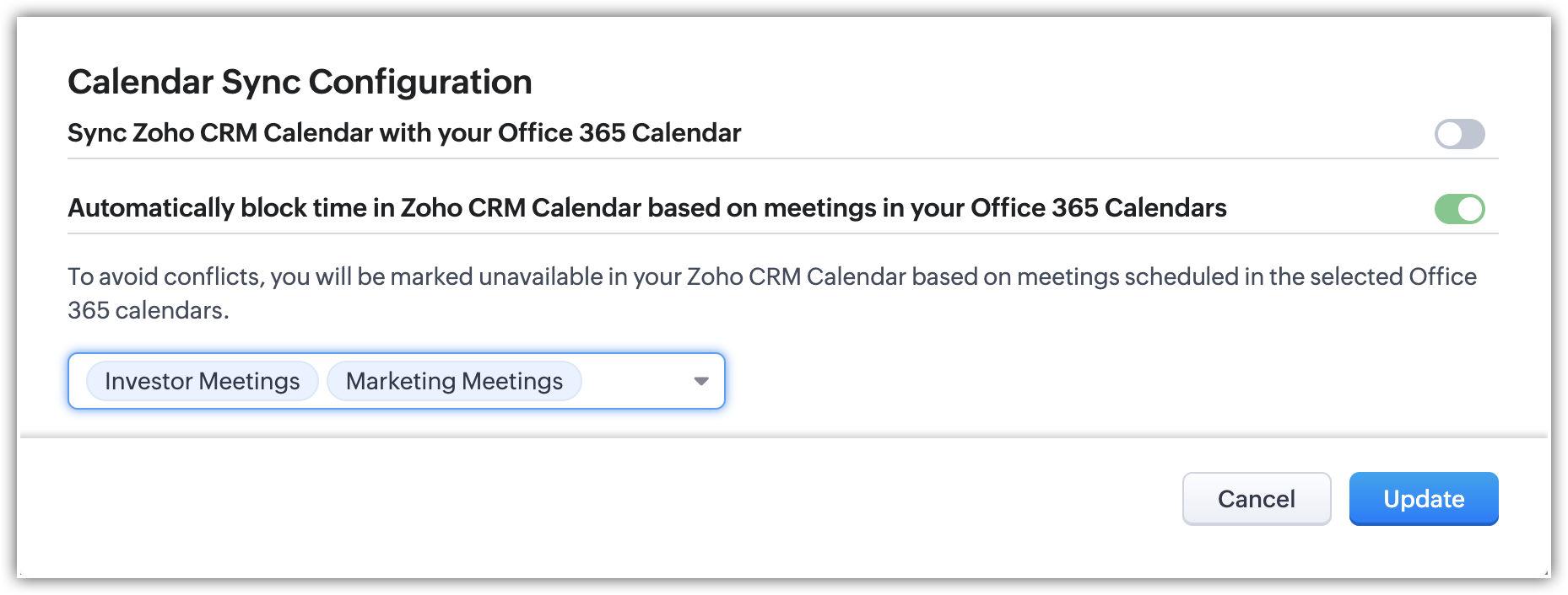 启用 根据您的 Office365 日历中的会议自动在 Zoho CRM 日历中锁定时间(如有需要)。