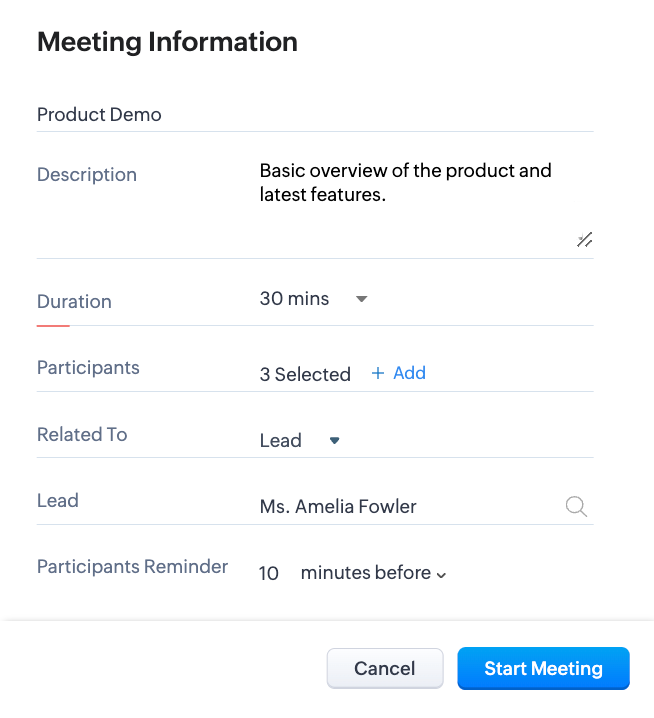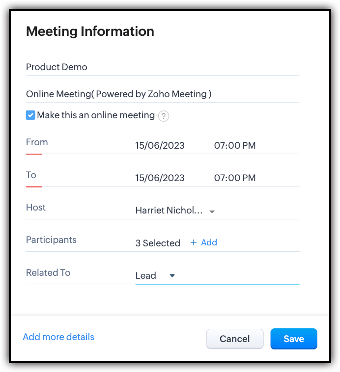 专业会议不一定总是面对面的。您可以选择在线进行产品演示,或者在公司其他分支机构的团队成员可以轻松加入的情况下进行线上讨论。会议解决方案提供商或网络会议软件为您提供了举办此类虚拟会议的选择,从而大大降低了成本并节省了时间。Zoho CRM允许您将您的CRM帐户与Zoho Meeting进行集成,这是一个网络会议解决方案。 一旦建立了集成,活动或会议就可以直接从您的CRM帐户进行。此外,您将能够在相应的CRM记录中查看与会者的数量和活动记录。