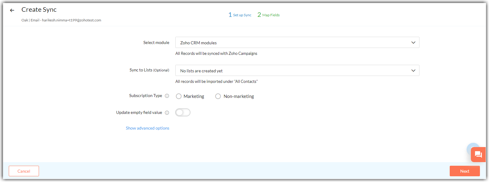 同步到列表:在这个可选步骤中,您可以同步Zoho Campaigns的任何邮件列表,或者创建一个新的列表。