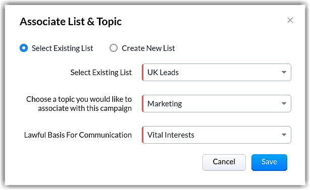 - 在关联列表和主题 弹出框中选择现有列表 或 创建新列表 然后执行以下操作之一: