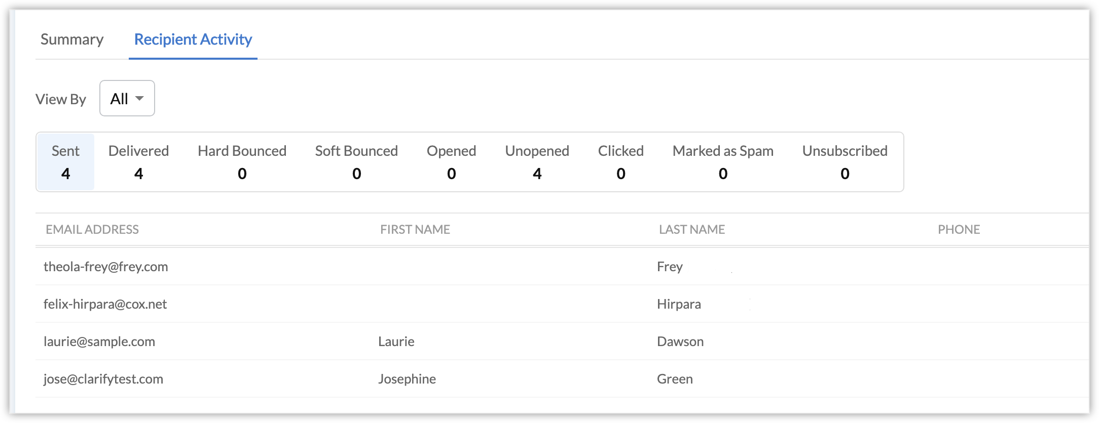 - 收件人活动:它显示了点击、退订、打开、标记为垃圾邮件等的收件人列表。您可以选择KPI,根据收件人的活动筛选和查看相应的收件人列表。您还可以从右侧的下拉菜单中过滤和查看每种响应类型的线索或联系人。