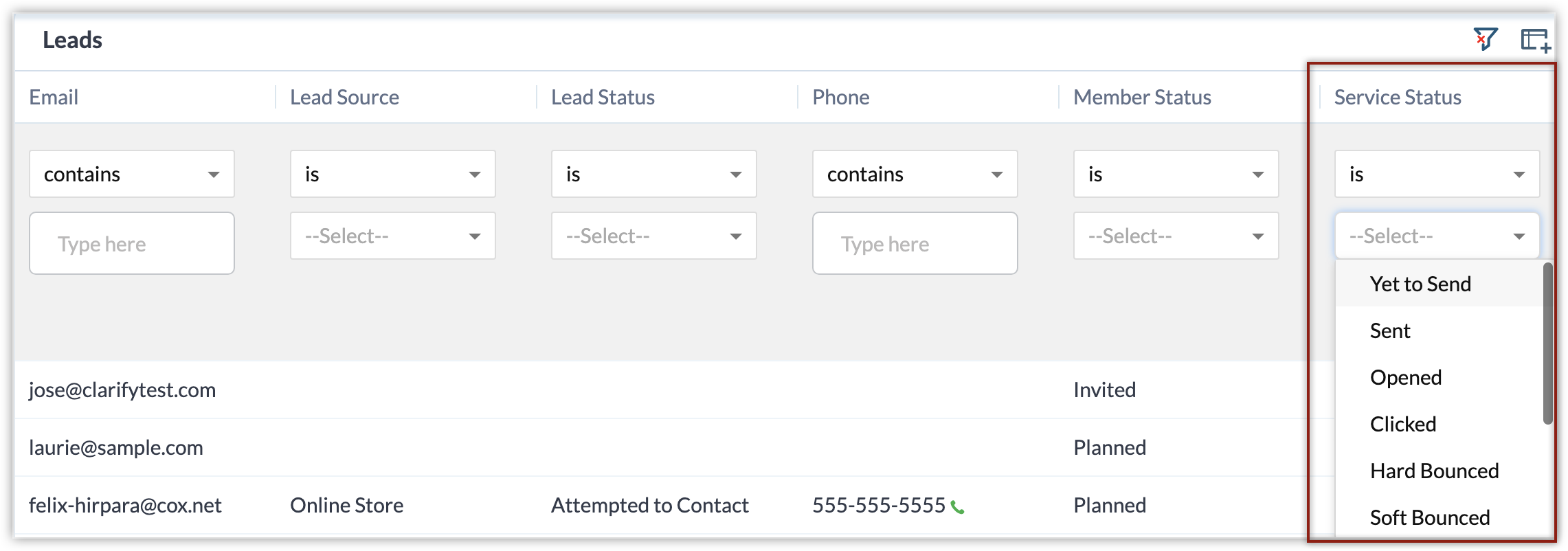 您可以根据线索或联系人对某个活动的响应来过滤他们。可以使用成员和服务状态来检查他们是否已被邀请,或者活动是否已按计划标记。类似地,您可以使用服务状态来检查电子邮件活动是否已发送、硬反弹、软反弹、已回复等。
