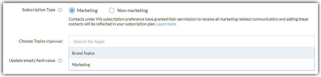 对于营销订阅类型,您可以从 选择主题 字段中的可用列表中选择主题。