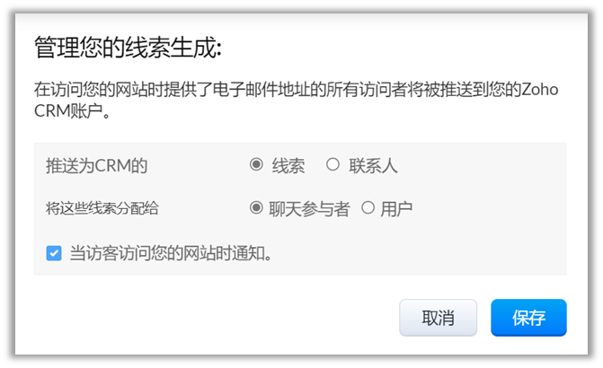 在设置中,管理员可以启用访客通知选项,这样,只要有访客访问网页,用户就可以收到弹窗通知。可以在Zoho SalesIQ中设置。设置 > 集成 > Zoho CRM > CRM配置。