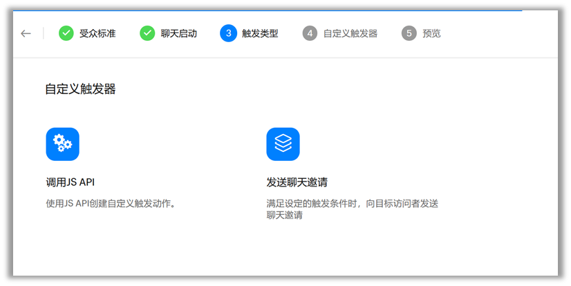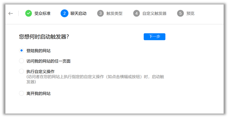 您还可以根据业务需求创建自动聊天触发器。您可以根据游客在您网站上执行的特定操作配置触发器,从而吸引访客进行对话。