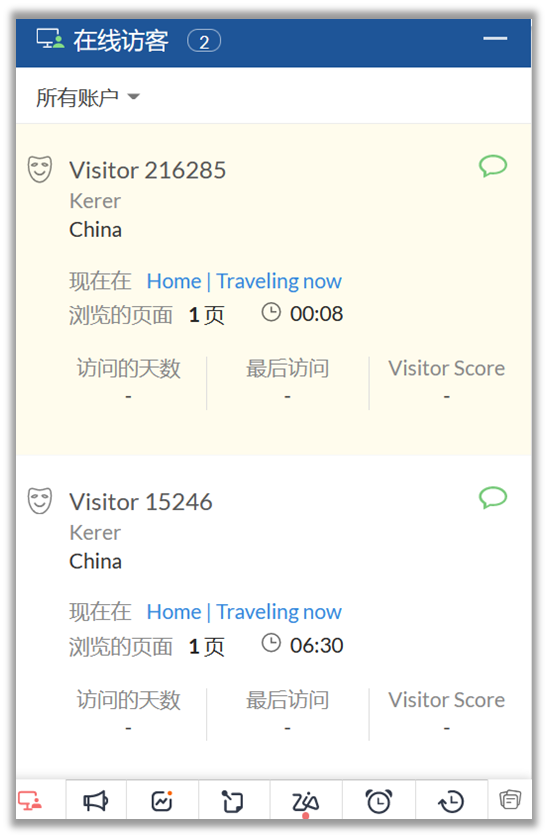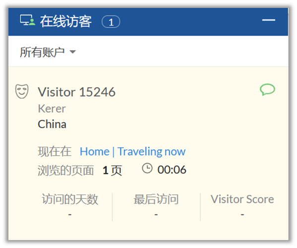 您会了解更多关于被访问的页面、在其中执行的操作、花费的时间等详情。此外,聊天记录将被附在记录上,您也可以为访客创建备注。