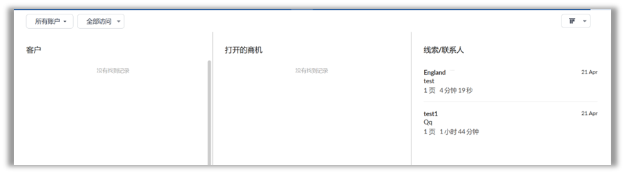 在Zoho CRM账户中,访问页签默认可用。您可以查看任意特定SalesIQ账户的访问数据。可用的账户列表将显示在下拉菜单中。一旦启用集成,在任意访问被捕获之前,访问页签都有发送给网站管理员链接。