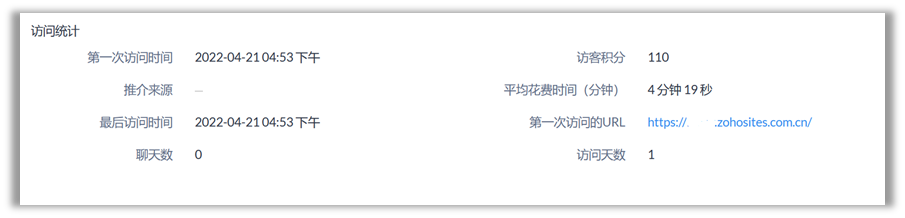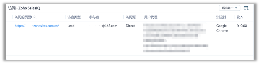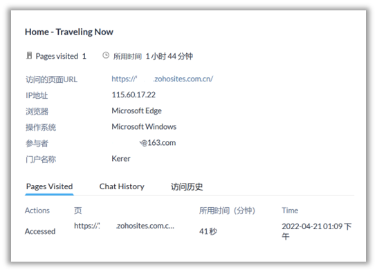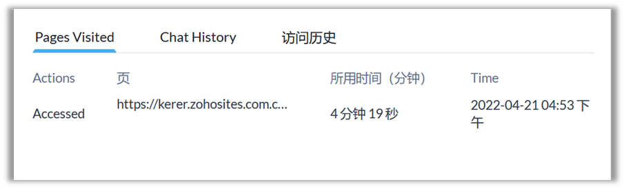 当访客访问你的网站并提供姓名和电子邮件地址与销售代表聊天时,访客的详细信息将作为访问页签的条目被捕获。如在网页上花费的时间、访问过的网页、IP地址、访问者的姓名等。