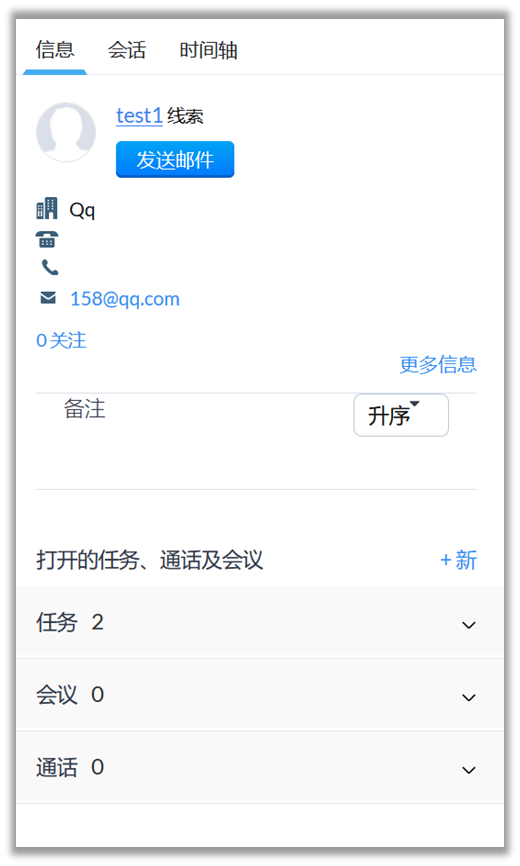 CRM视图提供与访客相关的所有详情整体视图。您可以检查CRM中已有的访客详情,查看聊天历史,访问详情,邮件来往,商机摘要,活动,备注等等。
