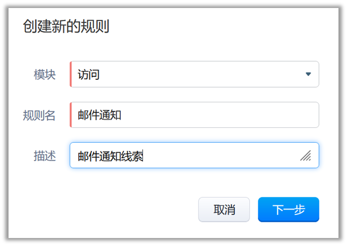 可以在访问创建时配置工作流规则。例如,访问创建后,您可能希望自动向相关线索发送邮件。这时,您可以为访问模块配置工作流规则。