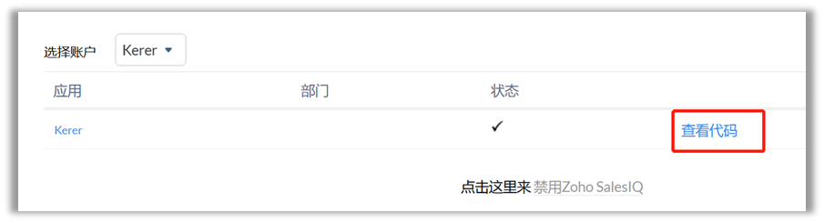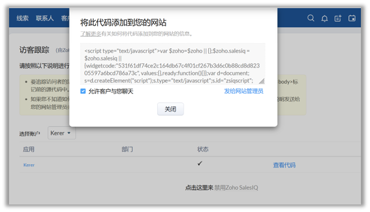 SalesIQ集成启用后,在访客跟踪页面将显示可用的账户。您可以从下拉列表中选择所需账户,并查看该特定账户可用的嵌入代码列表。