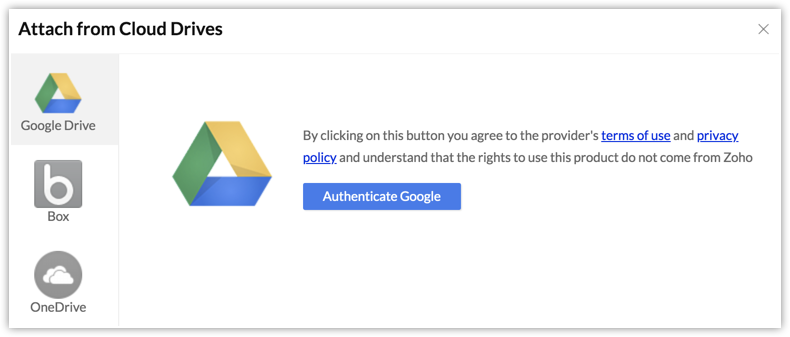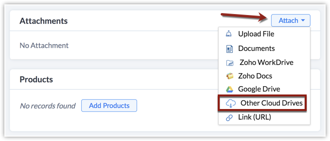 可以将文件从其他云盘附加到记录的“附件”相关列表中。支持的云盘包括:谷歌Drive、Box和OneDrive。