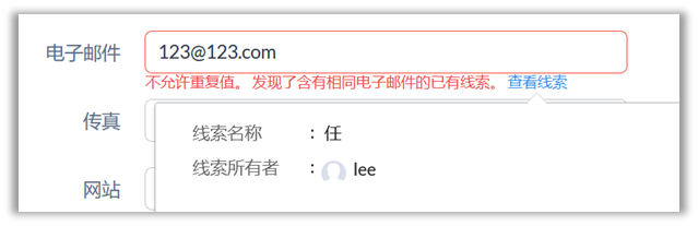 - 查找弹出框 - 从查找字段的弹出框中创建线索/联系人时,将会执行电子邮件地址重复项检查。