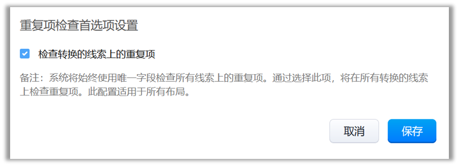 - convertLead API 方法 - 使用此 API 方法时,如果您转化线索,将会执行电子邮件地址重复项检查。如果 CRM 帐户中已存在类似的电子邮件地址,将不会转化记录。