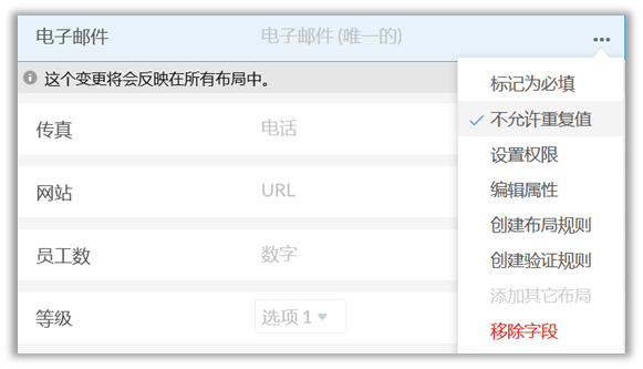 管理员或具有自定义 Zoho CRM 角色权限的用户能够将字段标记为唯一。字段在模块中被标记为唯一后,就可以防止在该模块中通过手动创建、导入、集成、Web 表单等方式创建重复记录了。