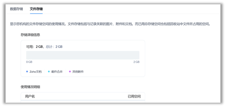 文件存储空间包括图片、附件(记录和电子邮件)、电子邮件模板以及与记录关联的文档所占用的空间。您可以看到按功能分类的存储详情,例如邮件合并和文档。已使用的存储空间还包括回收站中存在的数据和文件所占用的空间。