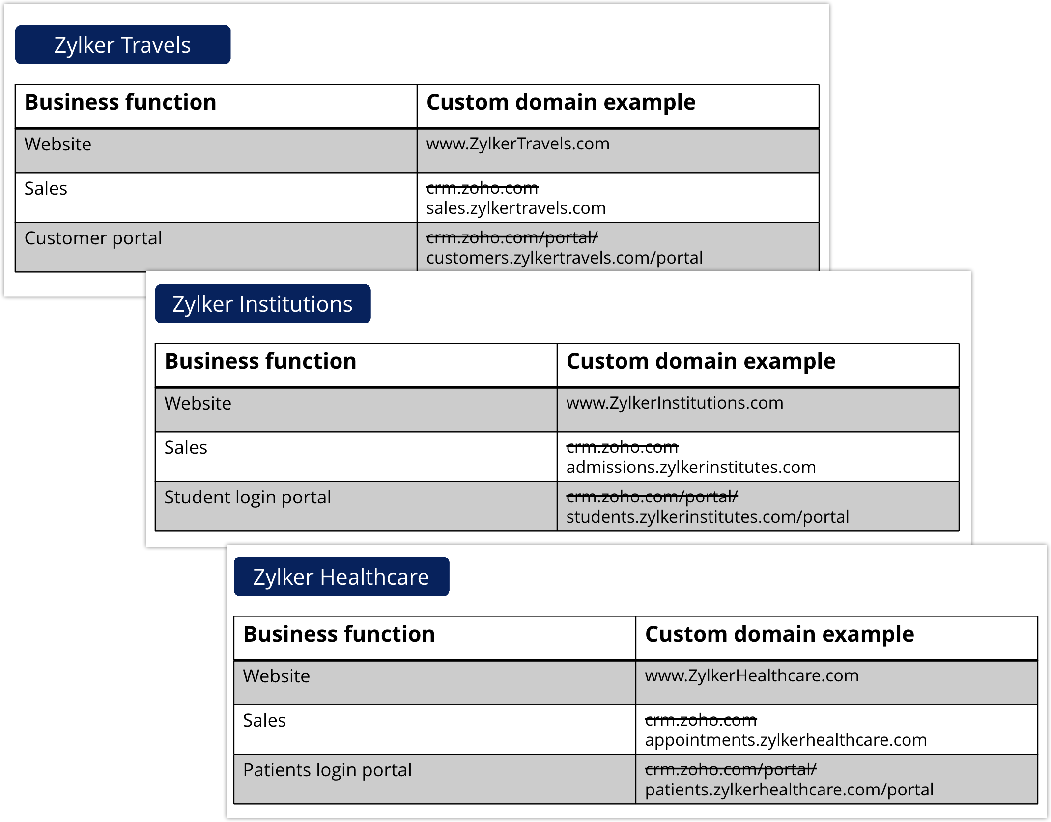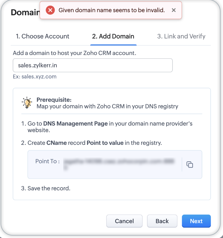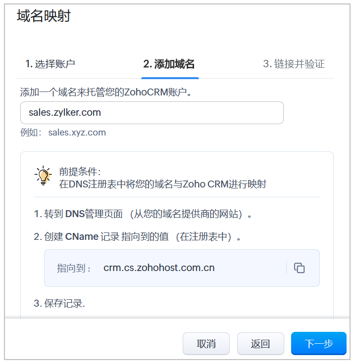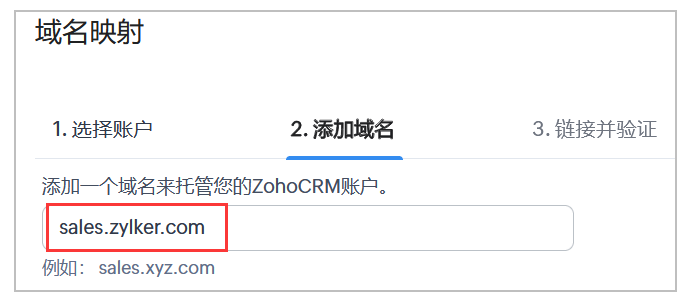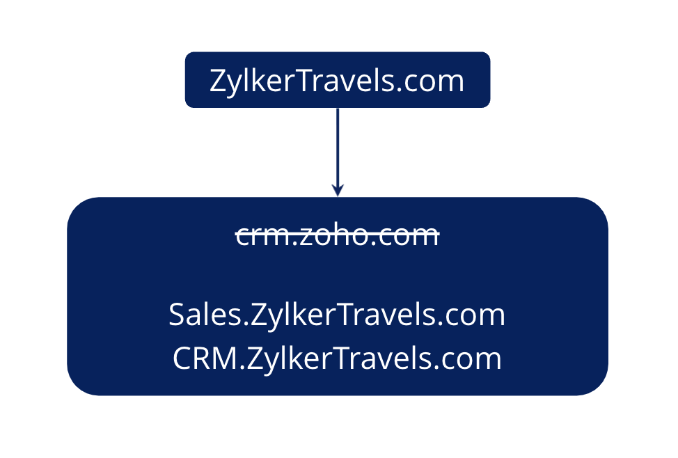 例如,在crm.zoho.com的例子中,“crm”是父域“Zoho”的子域或分类。 现在,代替crm.zoho.com,您可以选择使用自己的URL。 例如,sales.zylker.com——作为您的CRM应用程序所需的URL。