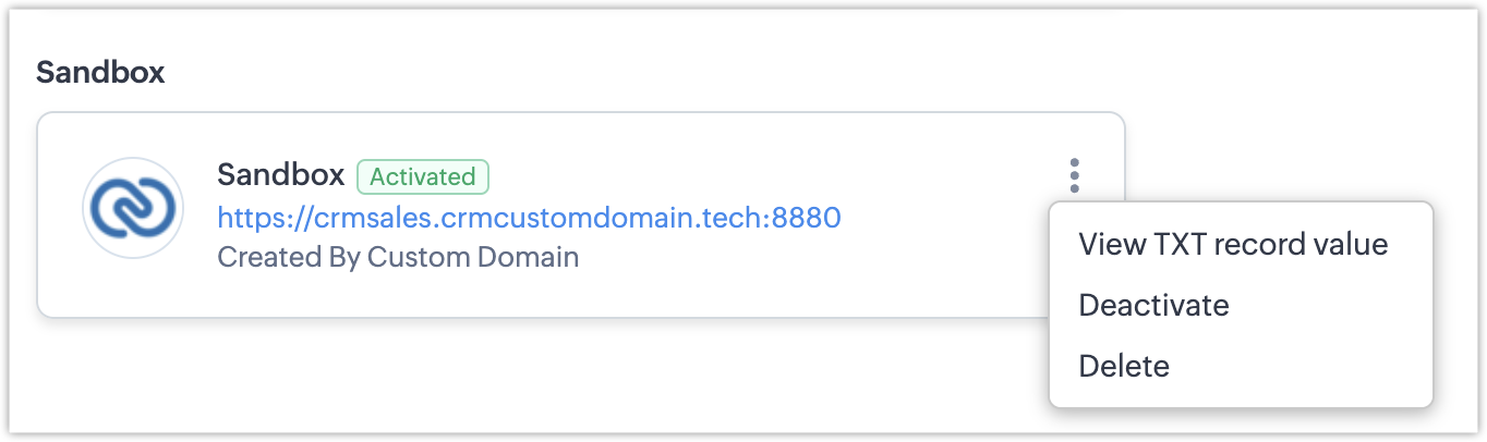 - 映射到生产环境(CRM)的域也可以映射到门户设置,但不能映射到沙盒。 假设我们有一个域名“sales.zylker.in”映射到了生产(Zoho CRM)环境。 则我们可以将相同的域映射到门户设置,但不能将其映射到沙盒。 这是因为生产环境与测试环境在本质上是不同的。 这就是我们在默认域中也有差异的原因。 虽然生产和门户设置都可以反映<crm.zoho.com.cn>,但测试环境称为<crmsandbox.zoho.com.cn>。 同样的区分也需要在自定义域中建立,因此映射到生产和门户的域不能映射到沙盒。