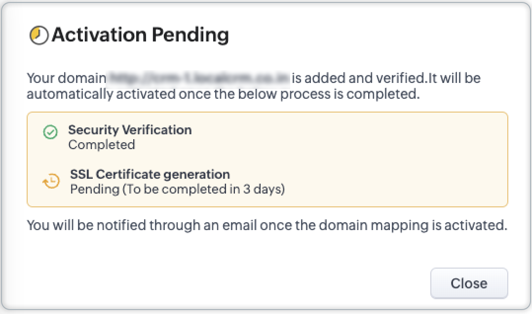 这将确保域所有权,在添加之后,将于Zoho进行安全验证并生成SSL证书后建立连接。 该证书将在验证之日起三个工作日内提供。