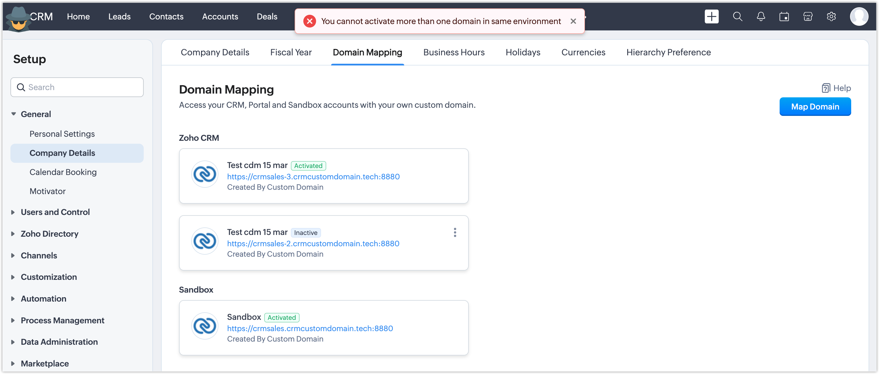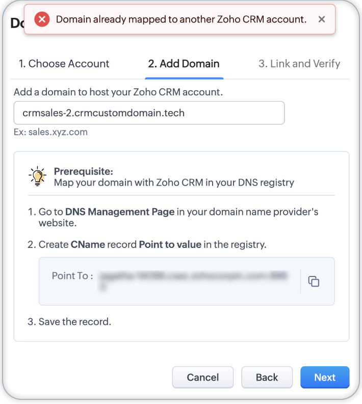 3. 该域已经映射到其它Zoho CRM账户: