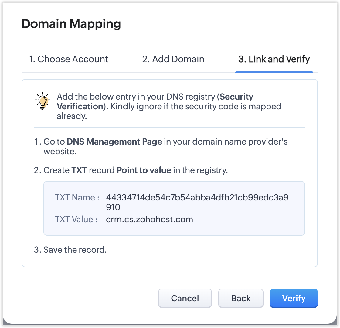 - 操作1: 在DNS注册表中使用Zoho CRM映射您的域。