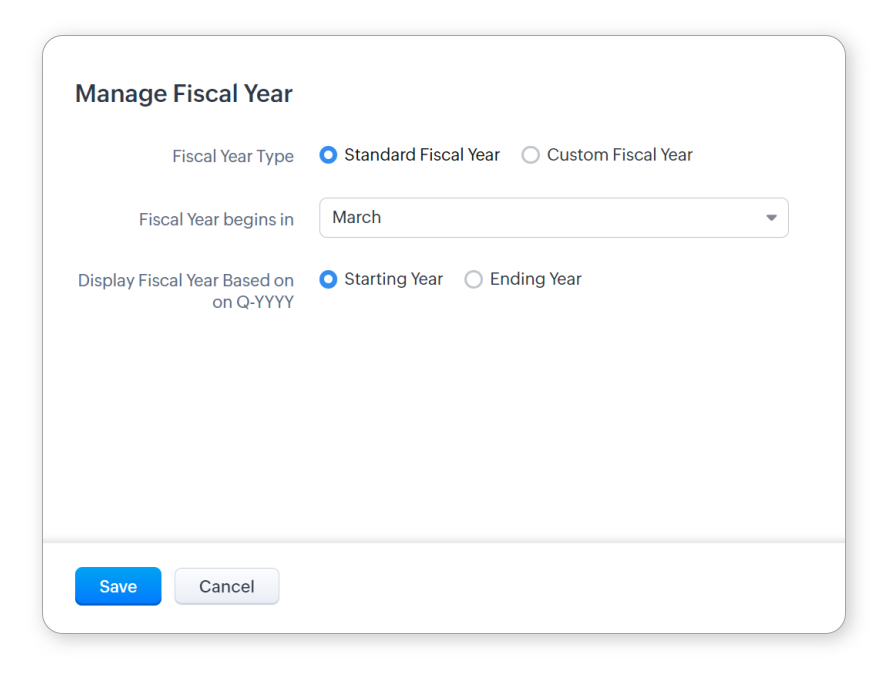 在Zoho CRM中,您可以选择适合您机构的财年类型: