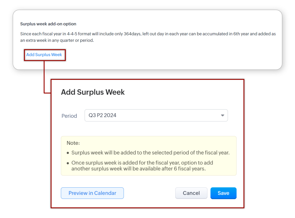 7. 添加盈余周 弹窗内, 选择盈余周要被添加到的周期。在日历中预览选项是可用的。