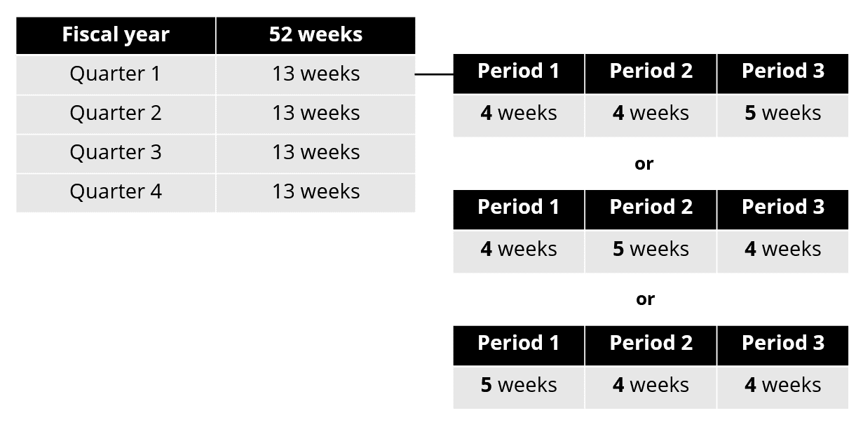 在许多行业,还需要将财年划分为比日历月更统一的期间。 因此,他们可能会把一个财年看作52周,而不是12个月。 例如,在零售业,周末销售的贡献通常超过工作日的销售。在这种情况下,零售企业希望将一个财年划分为包含相同数量的周末的各个时间范围。这增强了销售数据(跨周、时间范围和季度)的可比性,改进了预测,简化了工资计算,并简化了会计工作。许多零售企业都采用4-5-4财年格式。