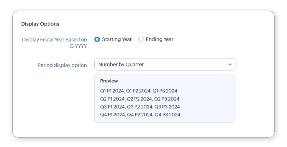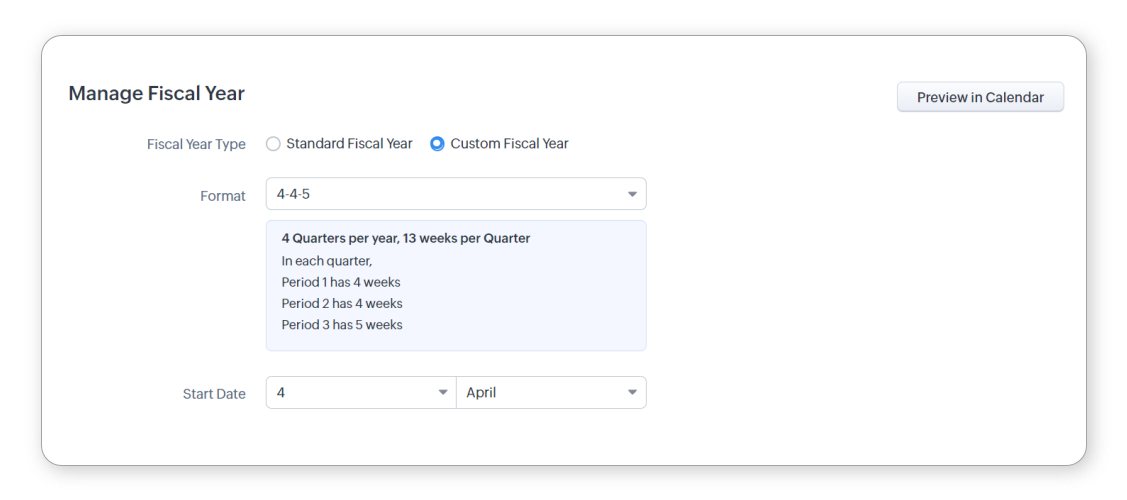 • 如果他们希望与其它财年模式保持一致,他们可以选择自定义财年格式并从可用选项中进行选择。