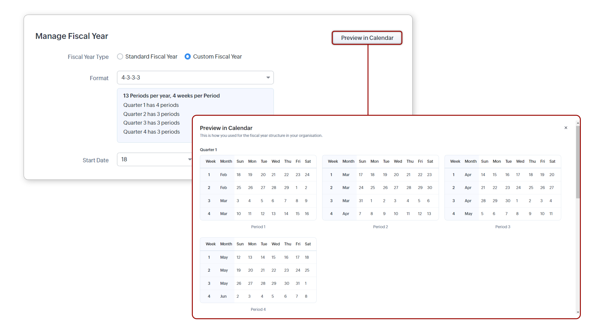1. 如果您选择了自定义财政年度,在日历中预览 按钮将可用于 :