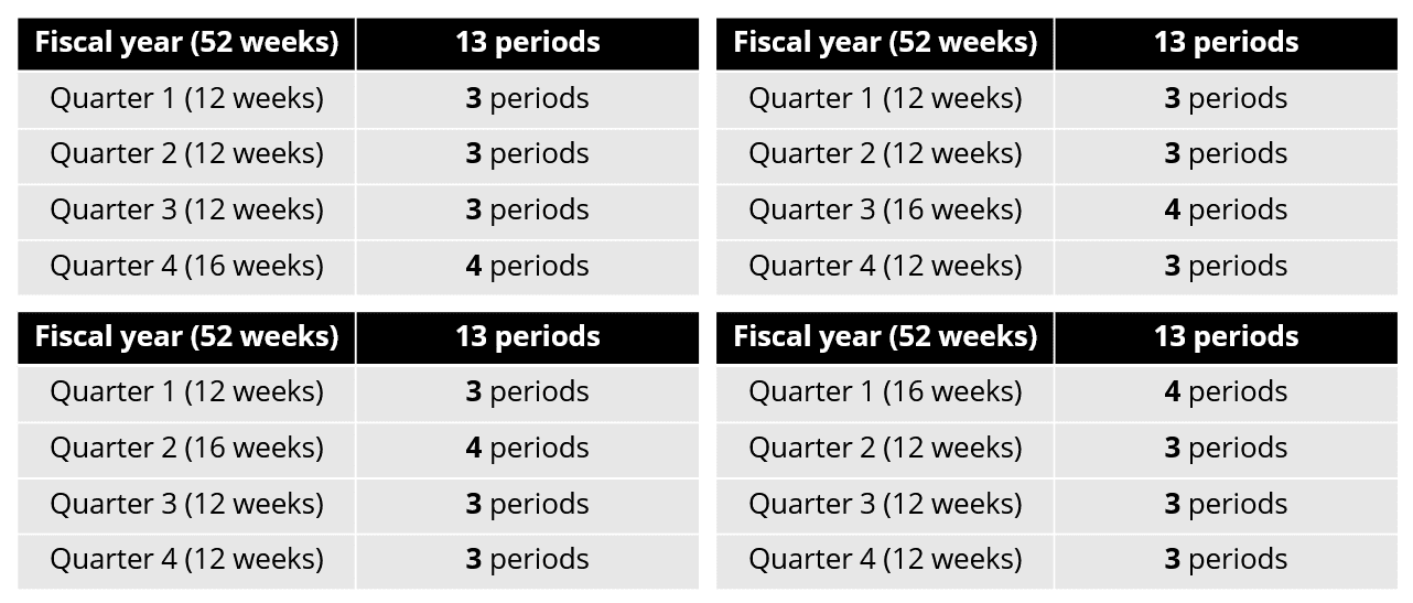 2. 3-3-3-4, 3-3-4-3, 3-4-3-3, 或4-3-3-3: 在这些以年为基础的格式中,每个期间由四个星期组成。 一个财年由13个这样的周期组成。 这些周期以3-3-3-4、3-3-3- 3、3-4-3-3和4-3-3-3的格式分布在四个季度中。 这些名称表示这四个季度中每个季度的周期数。