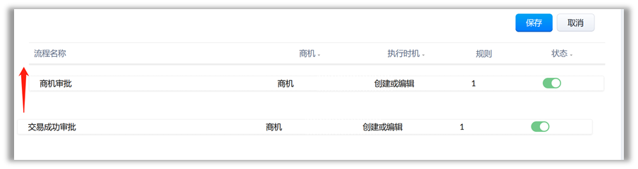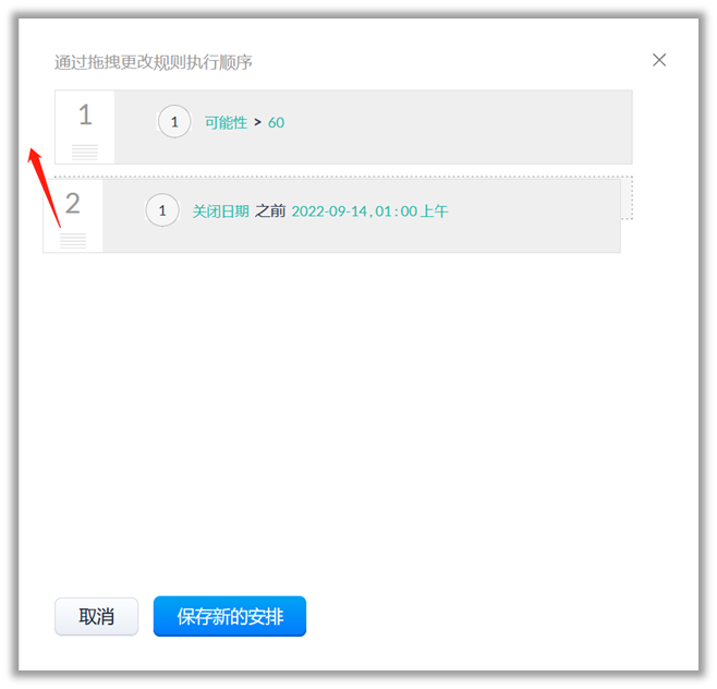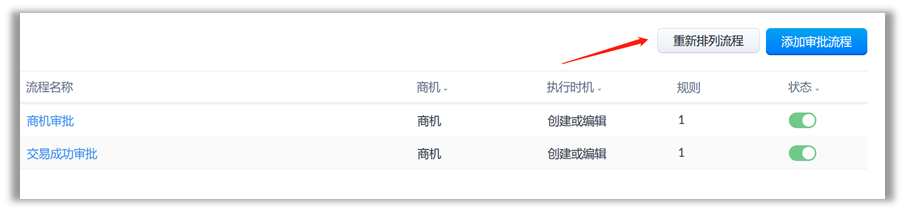 当一个模块中有多个审批流程,系统会检查记录是否符合列出的审批流程标准顺序。默认情况下,审批顺序是按照时间顺序排列的,第一个创建的流程在列表顶部。如果记录满足不止一条规则条目,将根据符合给定审批流程 的第一个规则条目提交审批。所以您可以根据需求重新排序审批流程,审批流程中的规则也是如此。