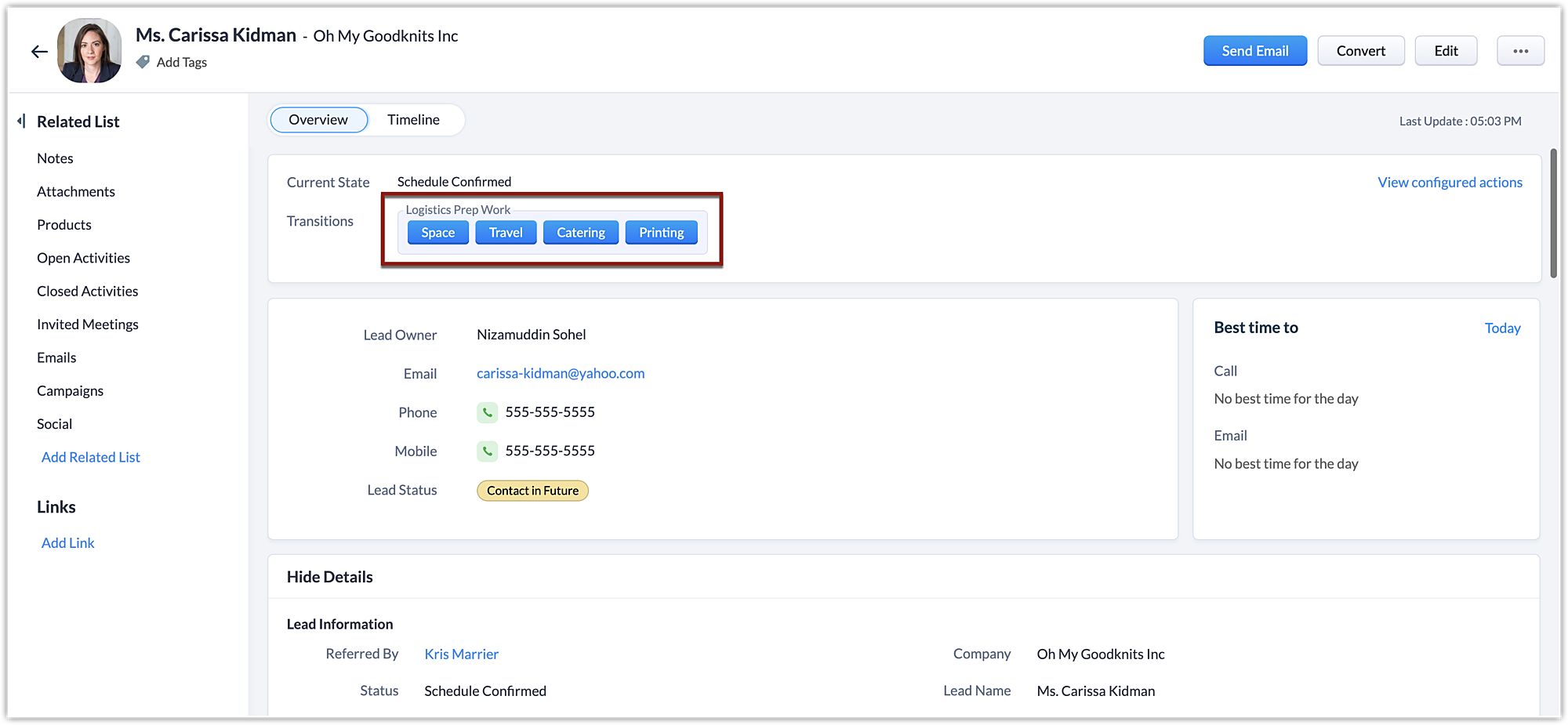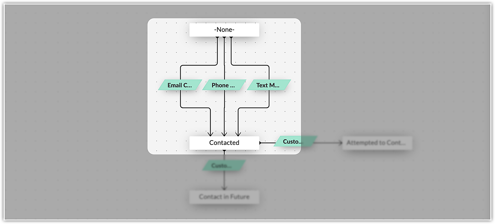 让我们以联系一个线索为例。 如果已通过任何一种方式(电子邮件、电话、短信)联系了线索,即用户勾选了三种可用迁移中的任何一种,则记录将从状态’无‘移动到状态’已联系‘。