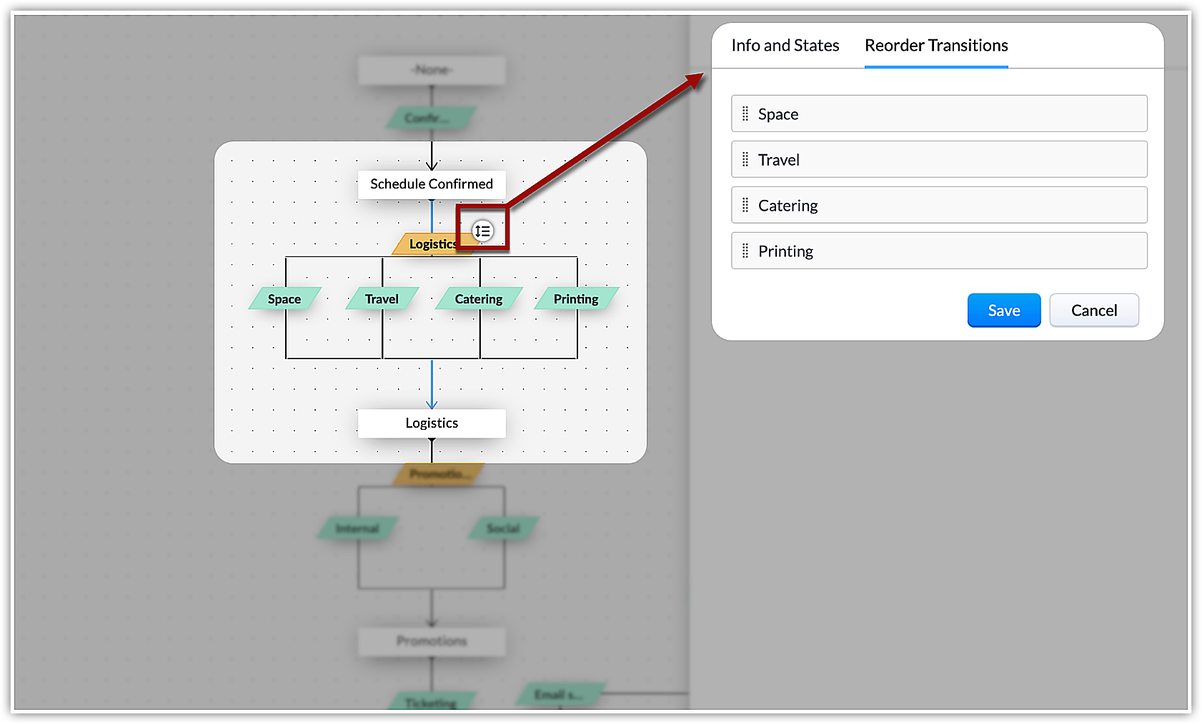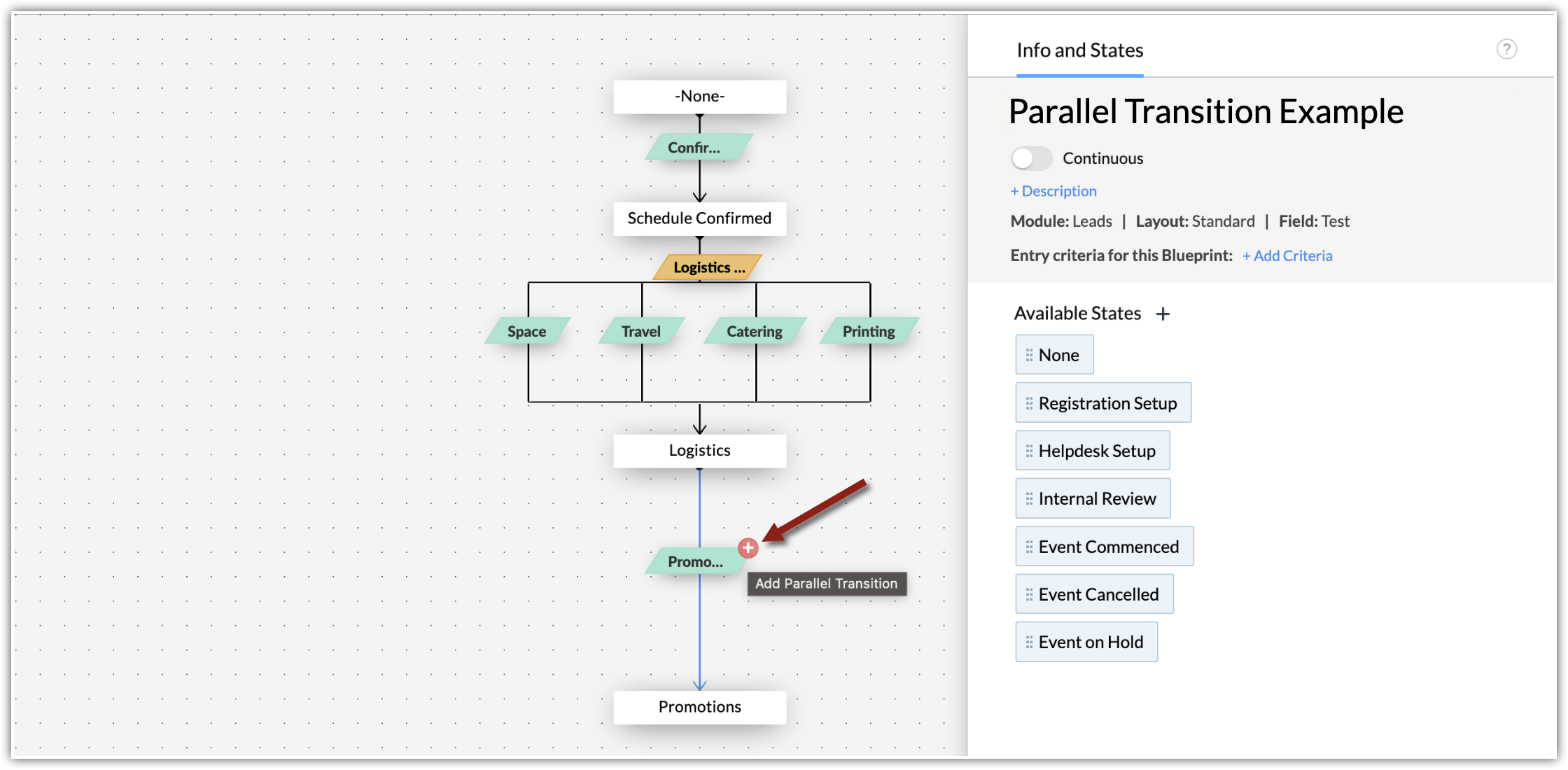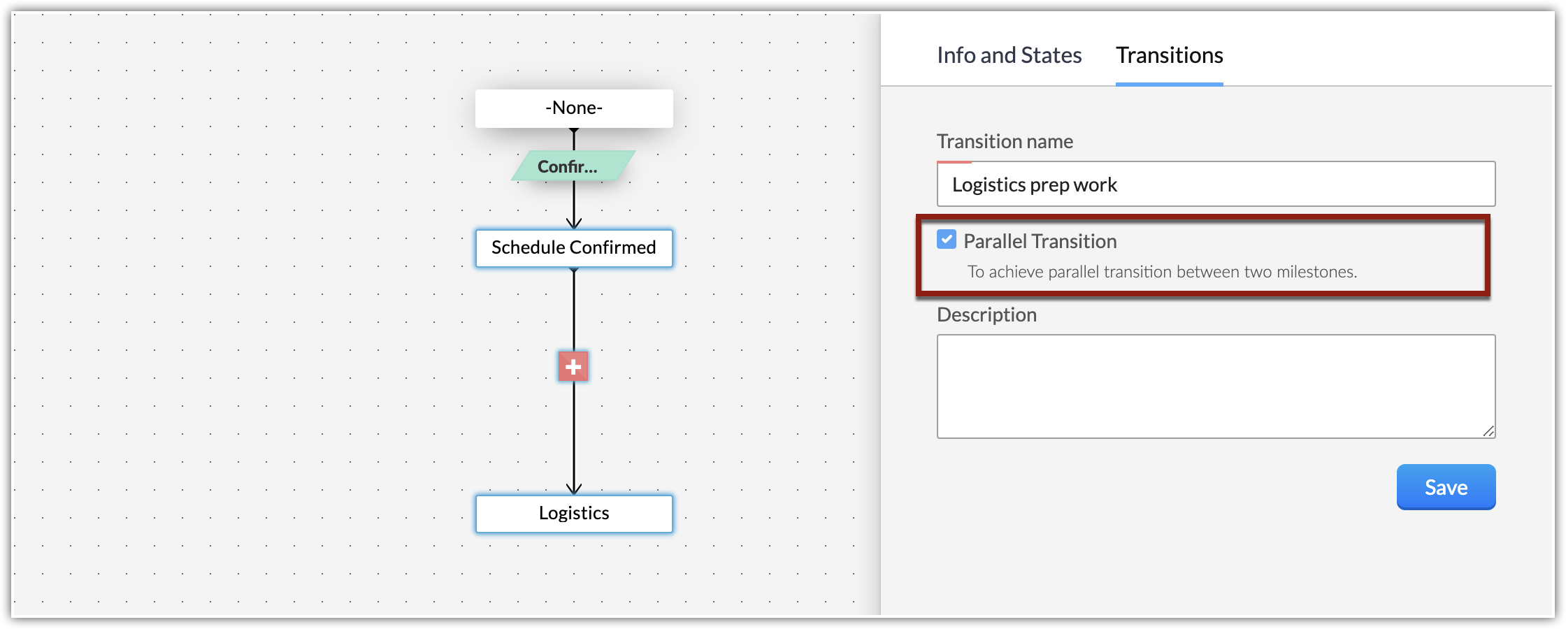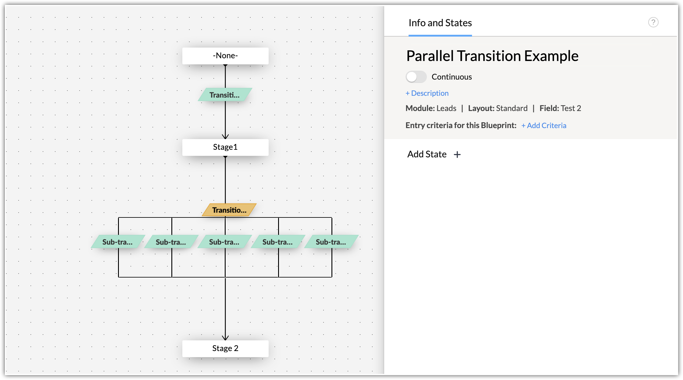 蓝图是使用状态和迁移来设计的。状态指的是流程中的任何阶段,而迁移是一个流程元素,它定义了一组条件和要执行的操作,以便在状态之间移动记录。 当您将蓝图中的所有状态与它们之间的相应迁移连接起来时,您将得到一个流程流,该流程流清楚地指出需要在什么时候、由谁来完成什么工作。