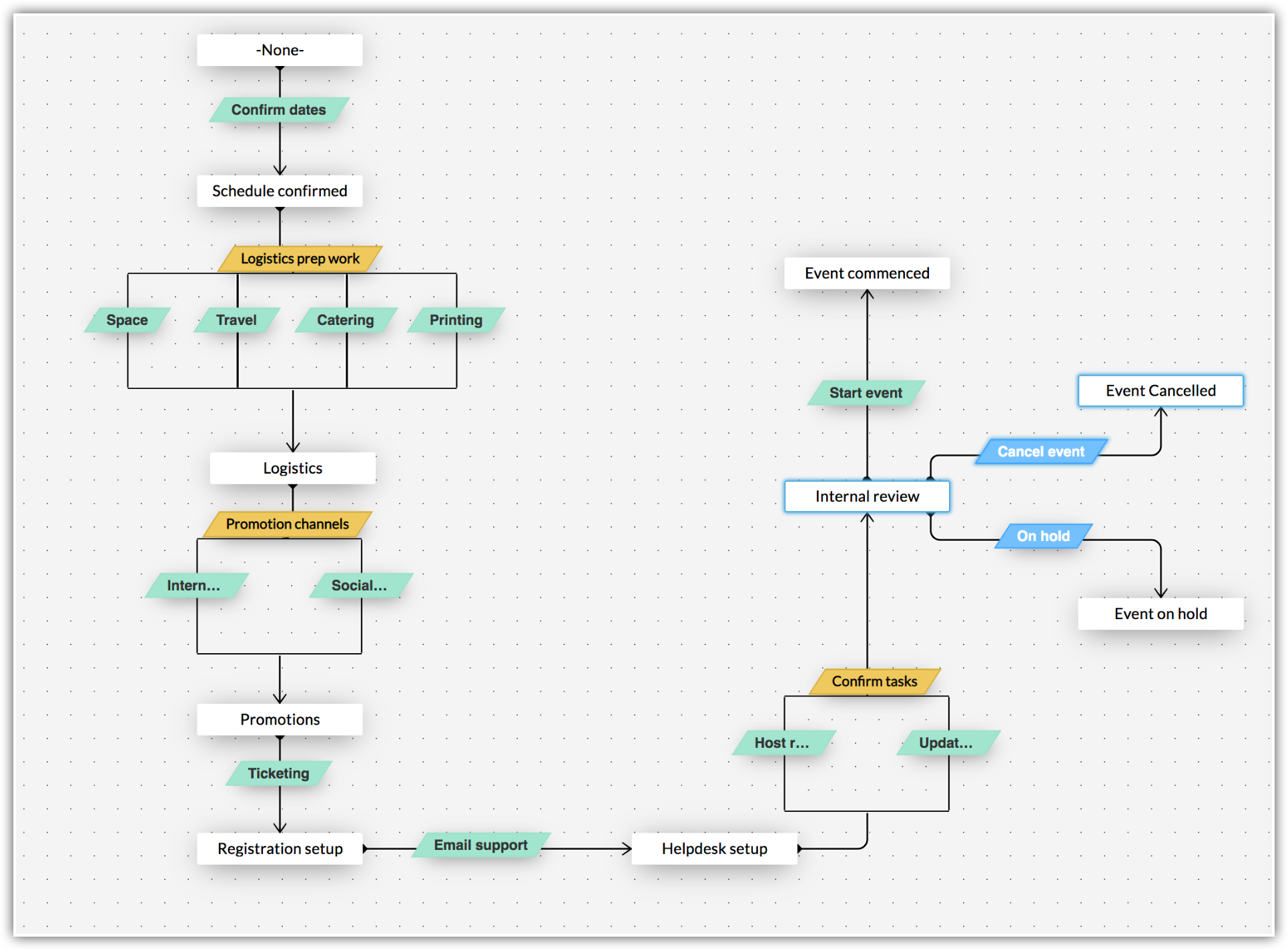 - 开始 > 安排确认 ---> 后勤 ---> 促销 > 注册设置 > 帮助台设置 > 活动提醒 > 内部审核 > 活动开始/取消/暂停