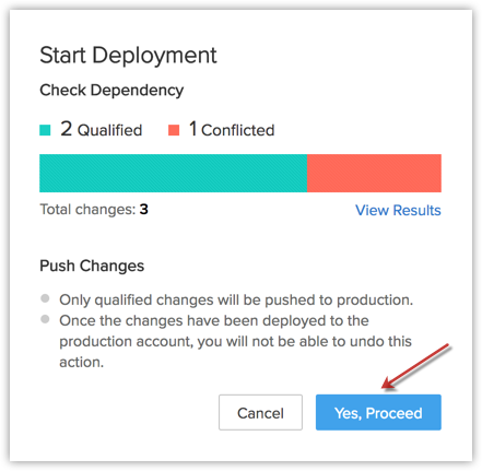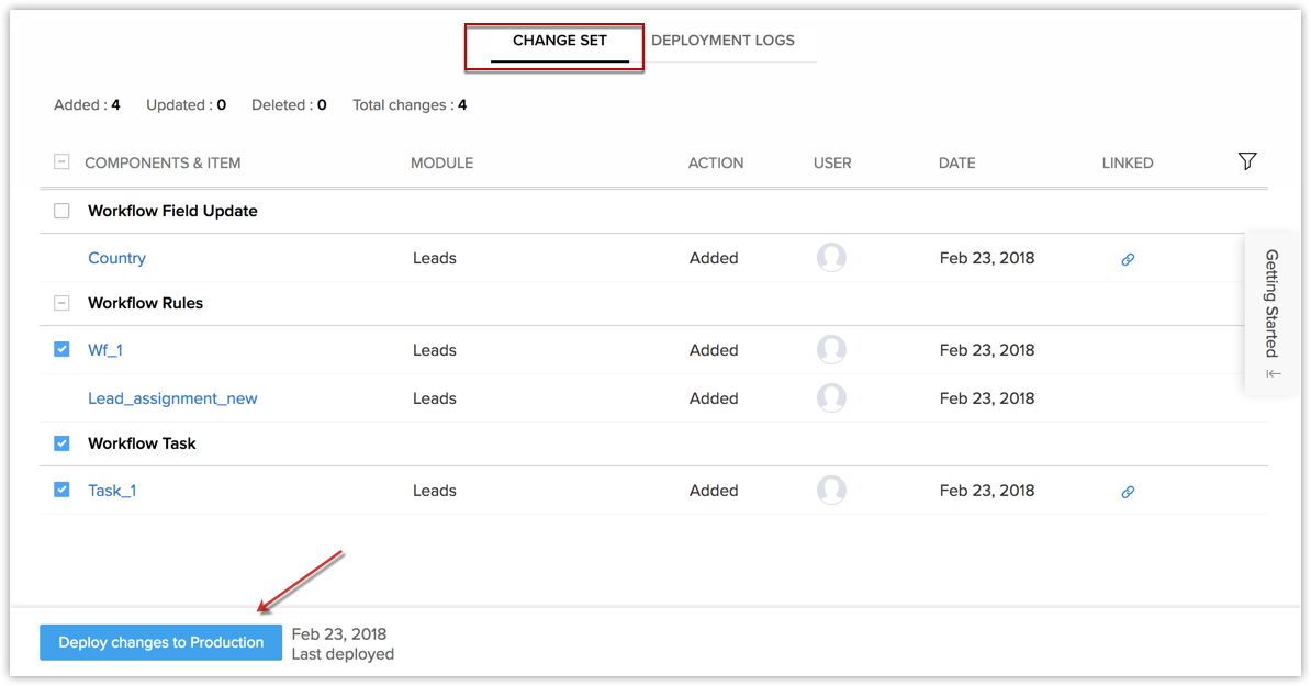 现在,“更改集”分栏下选中的所有/特定更改将部署至生产环境。