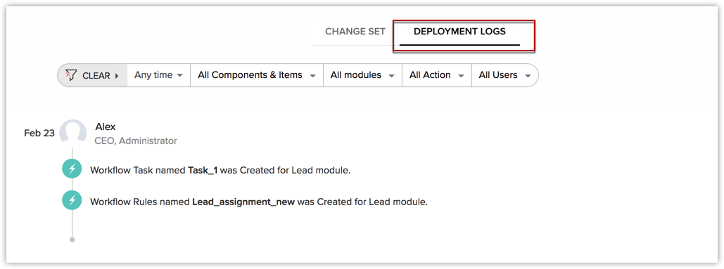 更改集旁边有一个部署日志页签,在此页签中,将显示有关已部署的更改的所有详细信息。还可使用过滤器以根据需求查看部署日志。