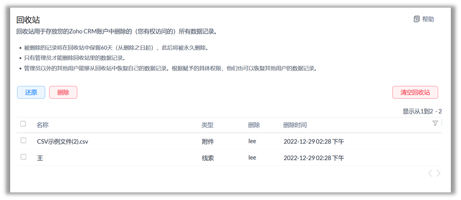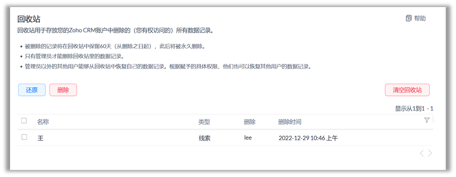 删除一条记录时,所有与其相关联的附件,备注,电子邮件,以及任务也会被移入回收站。所以,即使您没有直接删除数据,也会显示由您删除。在下图中,线索“王”被删除,与之相关的其它信息也会被删除。如果恢复记录,所有其它项目也被恢复。