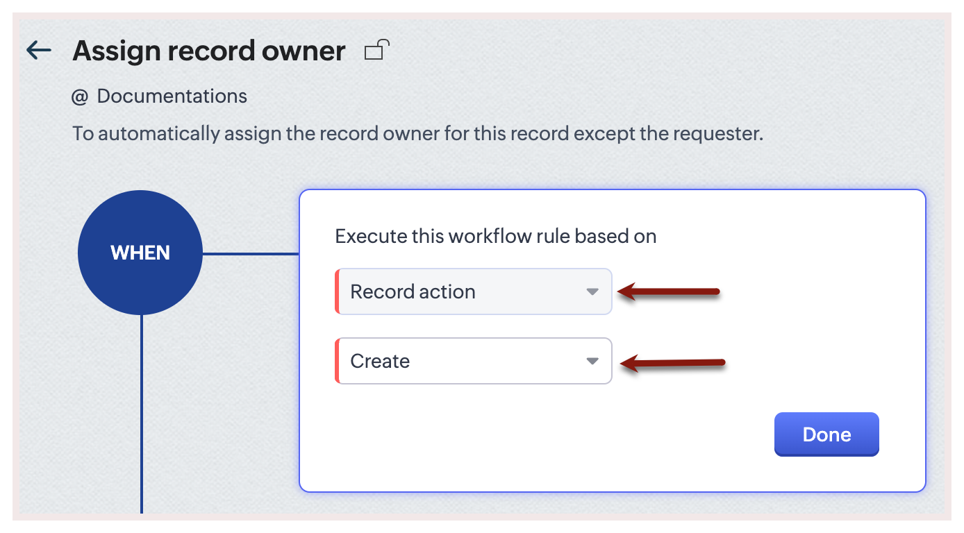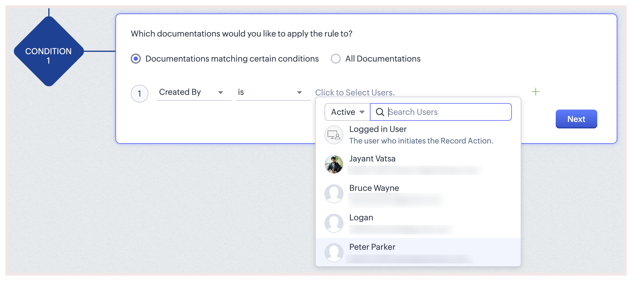添加您希望规则执行的条件。在这种情况下,该规则不应适用于所有记录,而只适用于符合特定条件的记录。因此,选择匹配特定条件。设置条件,选择创建者 > 是 > 用户(例如,假设用户为 Peter Parker,他是此模块的请求者,并需要更改记录的所有者)。然后点击 下一步。